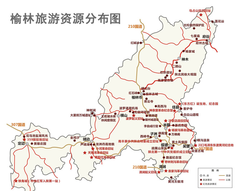 近年來,榆林緊緊抓住戰略轉型的機遇,依托豐富的旅游資源,高起點規劃,大資金投入,大手筆建設,成功的打造出了一批極具影響力的旅游景區。目前,全市已建成國家4A級景區3處,3A級景區7處,全國愛國主義教育基地1處, ------。各類歷史遺跡、人文景觀、風景名勝、自然風光數不勝數。其中國家歷史文化名城榆林古城、大夏遺都城統萬城、萬里長城第一臺的鎮北臺、全國最大的沙漠淡水湖紅堿淖、西北地區最大的明清古建群白云道觀、塞上碑林紅石峽、壯美秀麗的龍洲丹霞地貌以及楊家溝、高西溝、李自成行宮等旅游景區在國內外享有盛譽,已成為廣大游客熱捧之地。